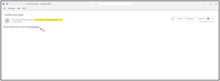 NOTE: The email will come from 1FiCS Connect Administrator – admin@onlinefoodeducation.com