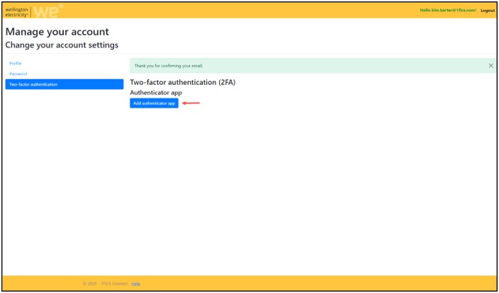 When you have Logged in using your Email Address and Password (as shown in step 6), the process will then take you through the Two-factor authentication steps. Click on the Add authentication app button.